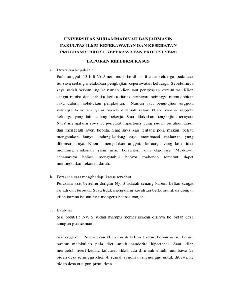 Contoh laporan diskusi refleksi kasus. Refleksi diskusi kasus merupakan salah satu metode yang mampu mengevaluasi bagaimana kualitas pencapaian kompetensi mahasiswa. Pendidikan keperawatan berkelanjutan melalui implementasi diskusi refleksi kasus . 13 kuesioner kepuasan perawat (kkp) terhadap kegiatan diskusi refleksi kasus . Laporan dengan format yang telah ditentukan.